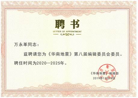 日前,世界杯官网万永革研究员受聘为《华南地震》第八届编辑委员会委员,聘任时间为2020—2025年。