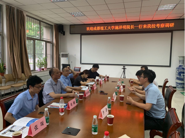 学院部分教师与成都理工大学来访人员围绕学科专业建设、本科生及研究生培养等工作进行了深入交流。会后,孙珍军陪同施泽明一行参观了地球科学院实验室。