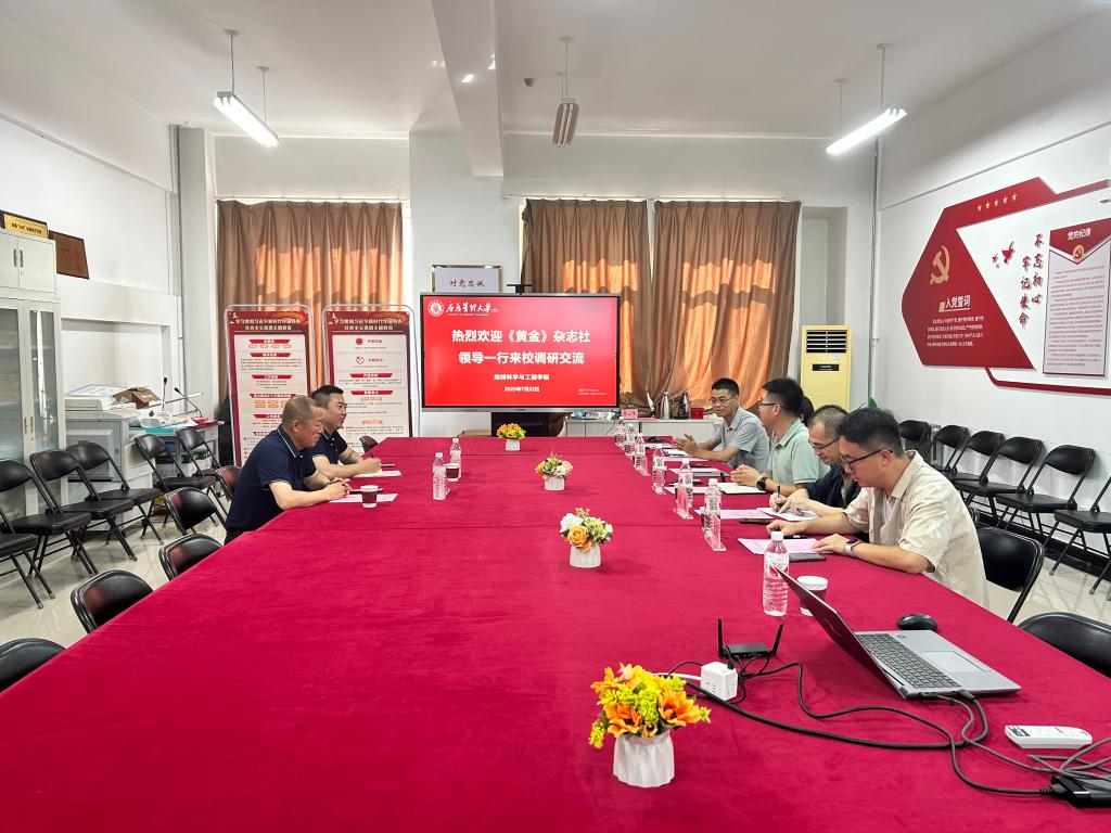 孙珍军对张继武一行的到来表示了热烈欢迎并简要介绍了地球科学与工程学院的办学历史、学科专业设置、人才培养、重点实验室建设等基本情况。张继武简要介绍了《黄金》杂志社的隶属机构、历史沿革、期刊定位等,希望能够与学校在防灾减灾、有色金属矿产成矿理论与勘探等领域开展合作,双方互相促进,提升学术影响力。王学阳介绍了《黄金》杂志社当前业务开展情况及取得的成果,希望与学校在科技情报人工智能大数据分析业务模块开展合作。与会双方围绕期刊特征及审稿周期、特约专辑、专刊等方面进行了深入交流,达成了初步的合作共识。