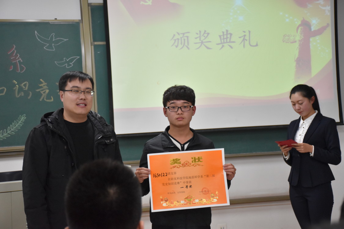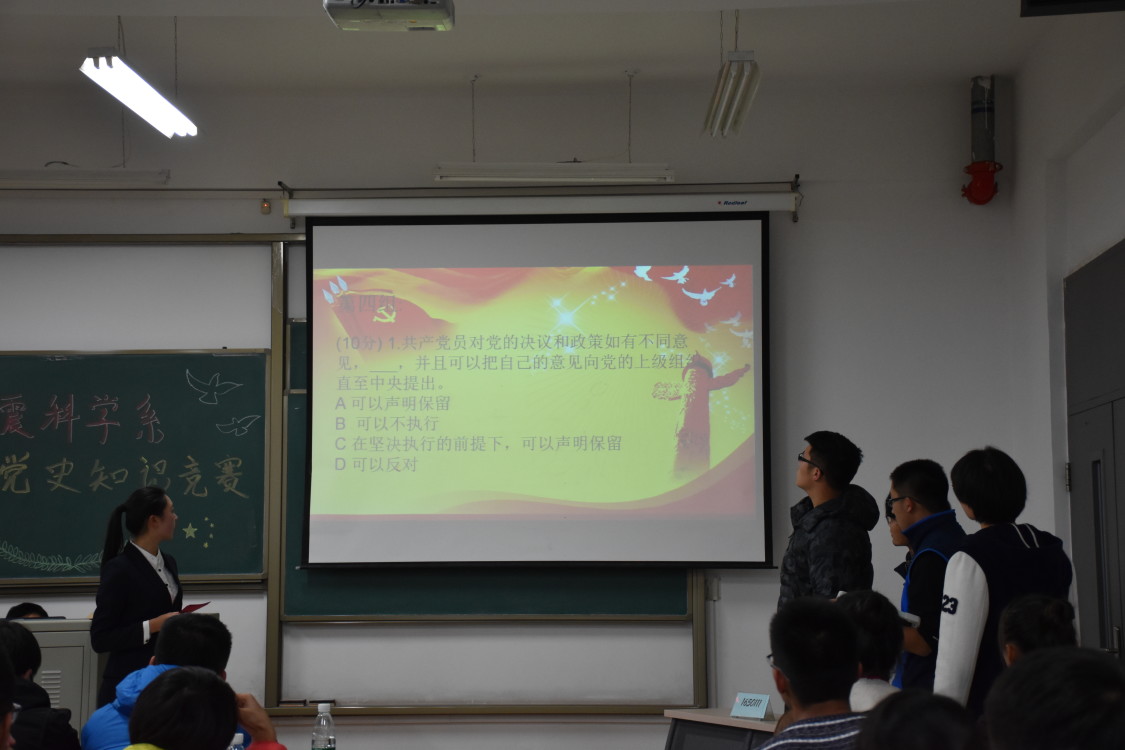 近日地震科学系组织学生党员、入党积极分子在北校实验楼308教室举办了地震科学系“党史知识竞赛”。地震科学系团总支书记唐圣华老师,地震科学系学生第三党支部书记张玉琛老师,地震科学系学生第二党支部副书记张震武,地震科学系团总支副书记陈建航,地震科学系学生会主席王立奇,地震科学系学生会副主席郑荣荧,地震科学系学生会副主席杨迪出席了本次活动。
