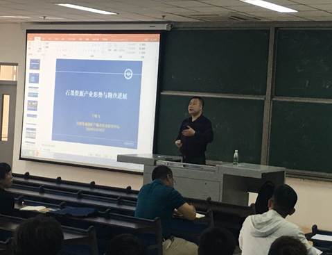 于晓飞教授在报告中介绍了我国“找矿突破战略行动”的相关情况,系统阐述了石墨的应用领域,并以新型材料石墨烯为例,详细介绍了该材料优异的性质、广泛的应用以及我国石墨烯资源的现状、国内外石墨烯产业形势和关于石墨烯资源勘查的进展与建议。报告内容丰富,信息量大,使师生们了解了矿产勘查行业的前沿进展,开拓了视野,增长了知识。